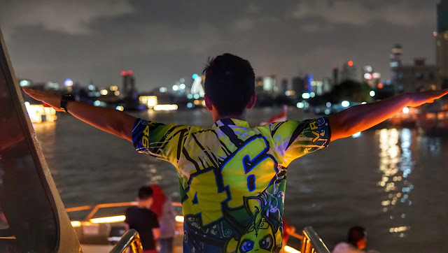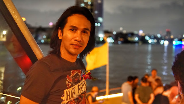 Namun begitu kami tidak dibenarkan keluar setelah semua tetamu-tetamu lain turun dari cruise tersebut.  Ada kejutan katanya.  Kami kemudiannya telah di bawa ke tengah-tengah sungai Chao Praya yang besar itu.  Di dalam kegelapan, kami melihat sebuah kapal dengan cahaya bertulis RHBAM berada di tengah-tengah sungai yang gelap.  Tiba-tiba bunga api melayang ke udara dengan tulisan RHB Asset Management dan diikuti dengan bunga api yang menarik dilantunkan ke udara.  Terasa diri kami ini sangat-sangat istimewa dengan layanan yang sungguh memukau oleh RHBAM.